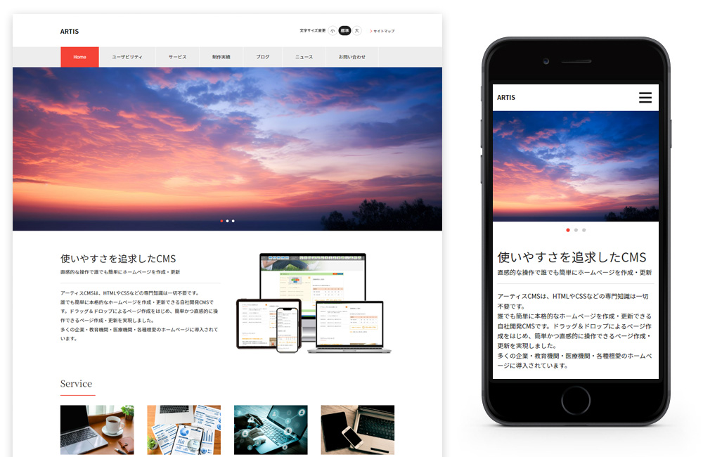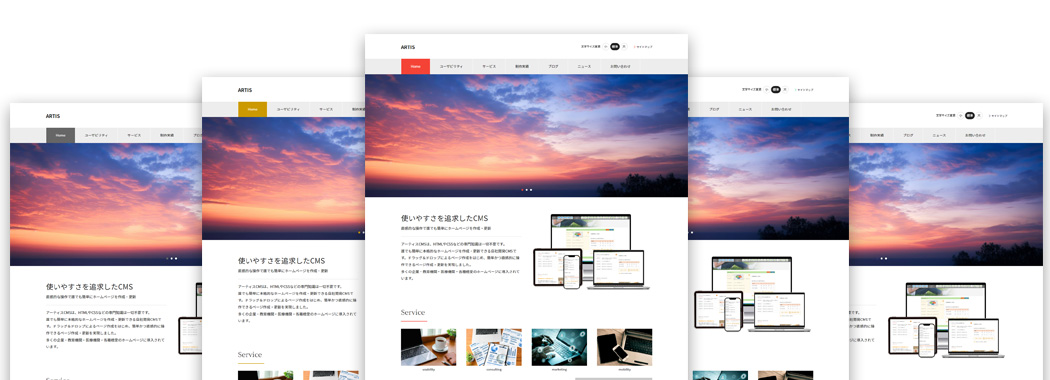 アーティスCMSクラウドは、プロのデザイナーが作成した多彩なデザインテンプレートから、自由にお選びいただけます。全てレスポンシブWebデザイン対応(スマートフォン対応)のため、スマートフォンユーザーにも使いやすいWebサイトを提供することができます。